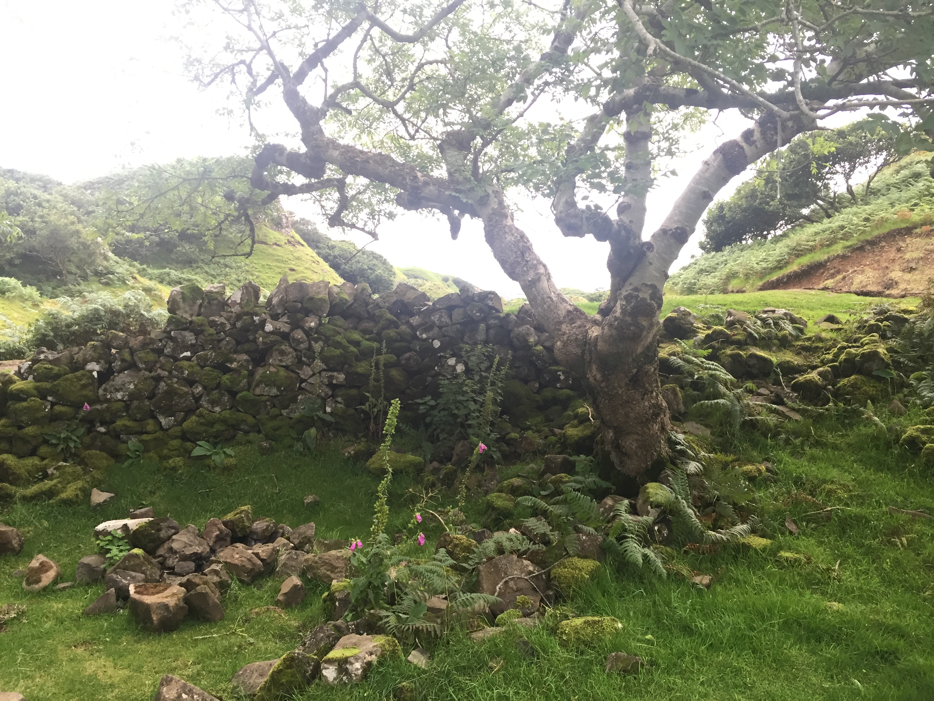 From the tower, we could hear a running waterfall in the distance and, after climbing down, we searched for the source. Dodging sheep scat and swarms of midges (Nasty little insects with the worst characteristics of both gnats and mosquitos. The secret to avoiding them is this: just keep moving. Walk, run, jump. Just don’t. Stand. Still.) we found the waterfall cascading down a hillside with a tree perfectly positioned at the source of the falls.