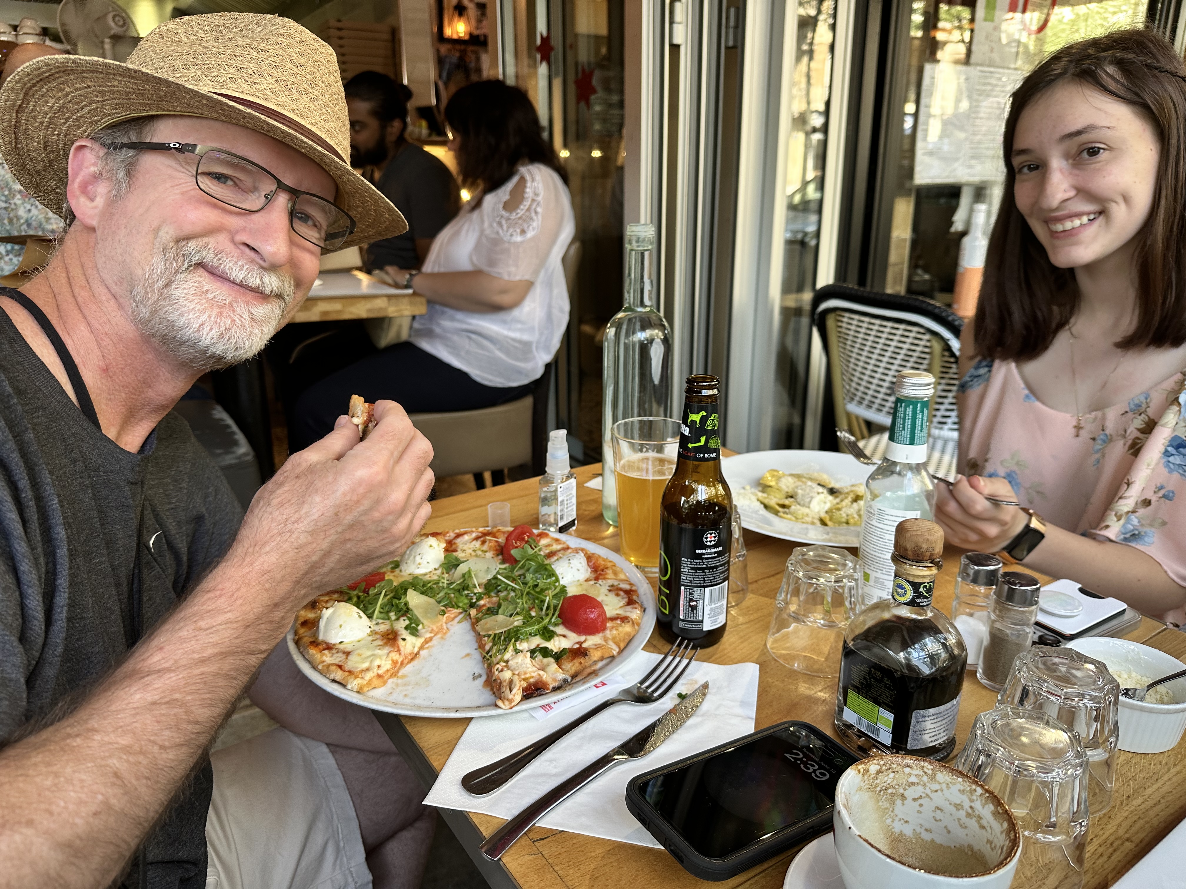 We started with perfectly textured, gluten-free Italian bread which, as any gluten-free person knows, is a rarity. For the main course, both the girls ordered another scarce dish: gluten-free ravioli! Though I couldn’t have the ravioli (sad face) because it was made with corn starch, I was able to eat the scrumptious Risotto all’Ortolana. Doug had a pizza all to himself, and a local beer. For dessert, I had the chocolate mousse and Jacquelyn had the panna cotta.