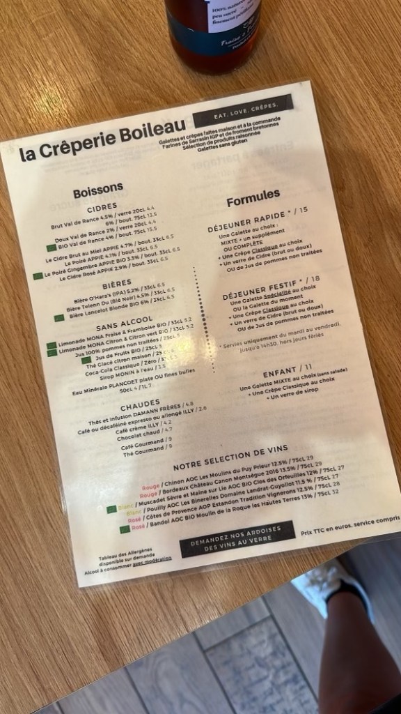 For dinner, Jacquelyn and I walked to la Creperie Boileau, ordered take-out for everyone, and then Ubered back to the Airbnb to keep the food as fresh as possible. It’s a very small restaurant with seating for maybe 15 people. The server was very helpful and patient with our english and allergies; and they were willing to make any meal with the gluten-free crepes. Highly recommend!