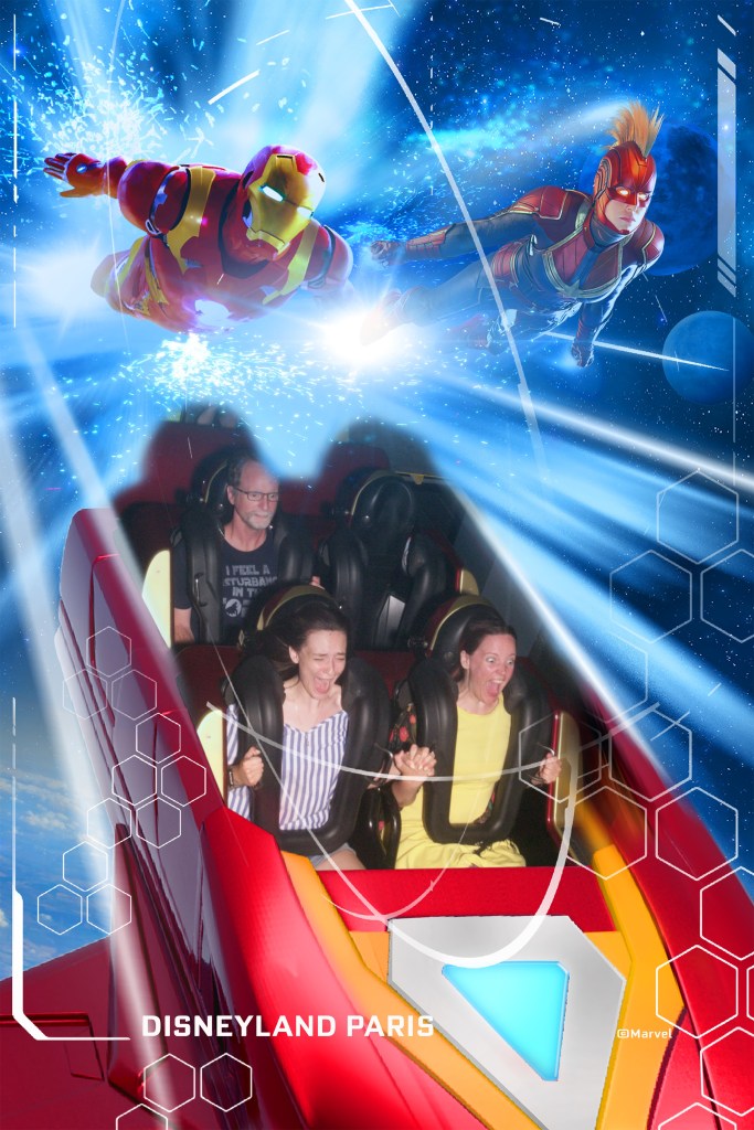 The Paris version is Star Wars themed, has sidewinder loops, and is much faster than ones at home. The girls said it was somehow even darker than the USA versions, so dark they couldn’t see much of anything. It was also rough and painful, particularly for Jacquelyn, which affected their rating of the ride.