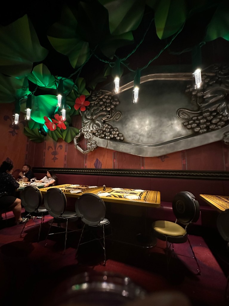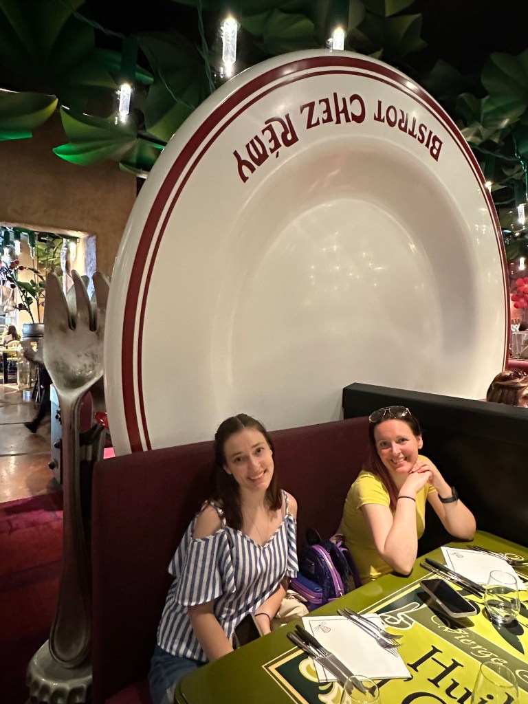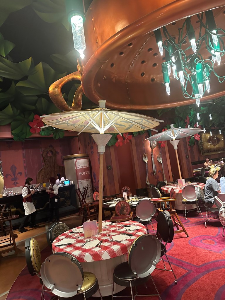 Our first stop was for dinner at Chez Remy, where everything is designed to make you feel as though you are the size of Remy the rat from the Disney movie, Ratatouille. You can read more about the meal below, under the heading “Dinner at Chez Remy.”