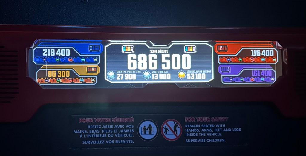 The ride itself is extremely slow and mild, so the game is the main the feature. That said, this is one of the few rides where I really enjoyed the queue and the pre-ride show featuring a digital Tom Holland speaking in french and pronouncing “Spider Man” as “Spee-duh Mon”!!!