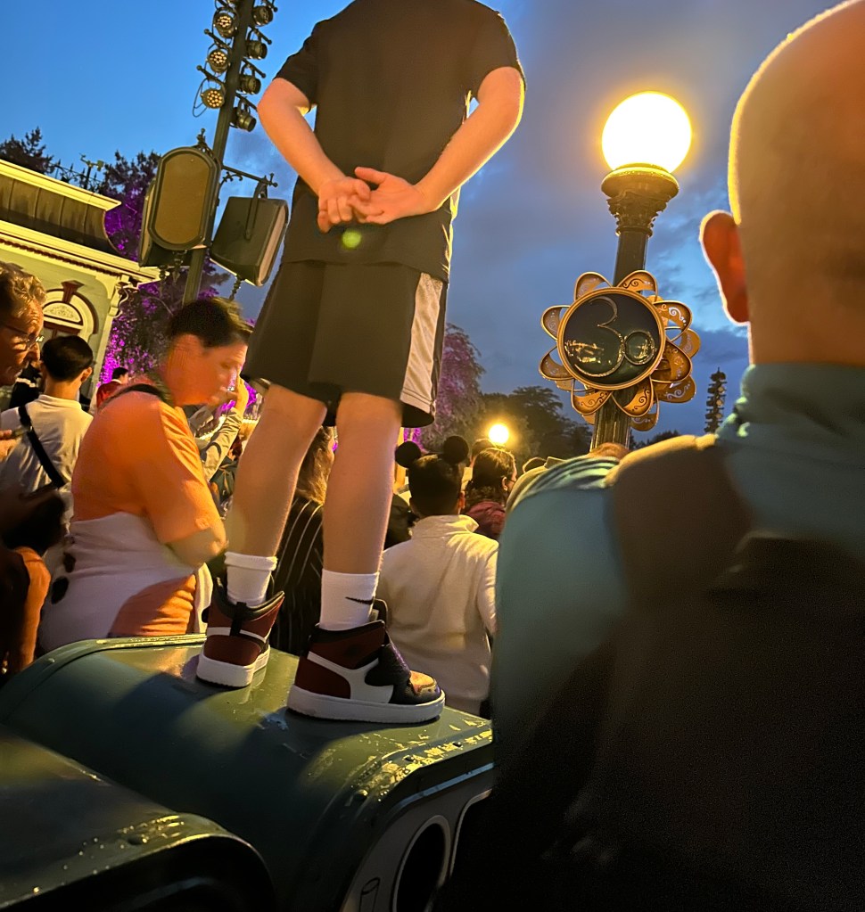 • The manners and expectations for viewing in Disneyland Paris are wildly different than in the USA. What I found most disturbing was that parents lifted their kids up to stand on wet trash cans (or other objects) and then walked away. Not only was this incredibly rude to anyone NOT standing on a trashcan, it was unsafe. I realize that it sucks for kids (and adults) who are too short to see over taller adults and too big to be held by their parents, but it’s still rude and selfish to block everyone and anyone else. In the USA, Disney cast members do not allow people to stand on trashcans or lamp posts or giant rocks, and I quite prefer it. I’ve heard that in Japan, everyone sits for shows. Wouldn’t that be amazing?