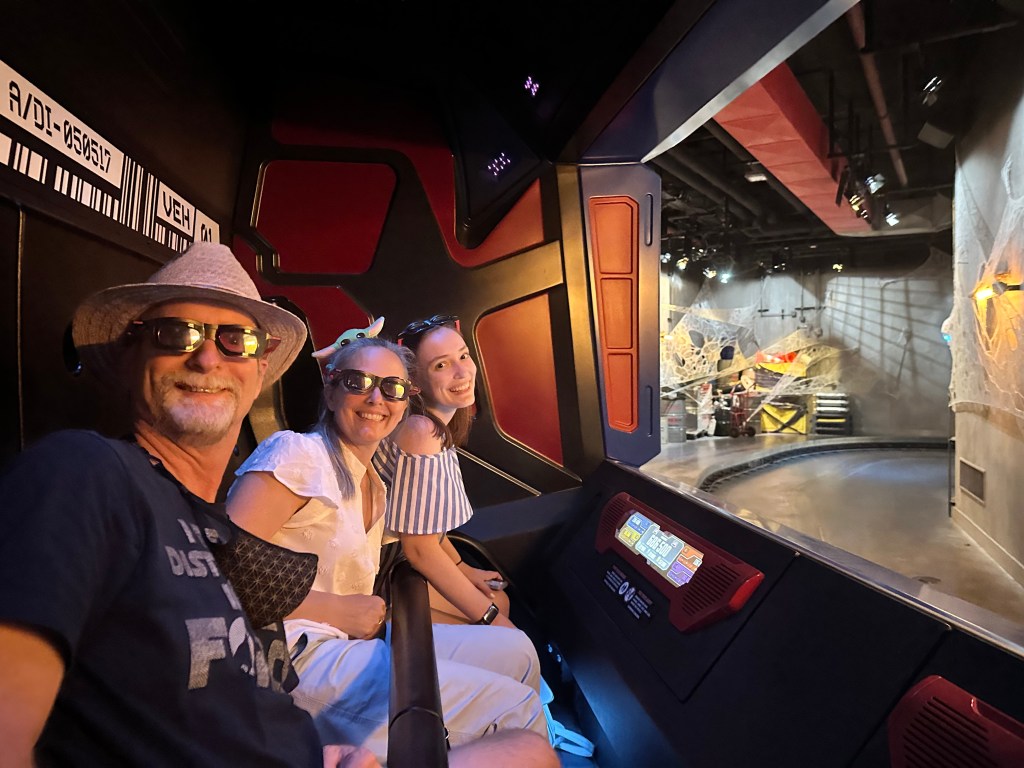 This ride is NOT related to the new Star Wars rides in either Galaxy’s Edge in the USA. It is an older ride that we’ve all ridden before, but it makes everyone except Doug incredibly nauseous and/or claustrophobic. We’ve tried to like it. We just can’t. Doug really enjoyed it and the seven star rating is entirely from him.