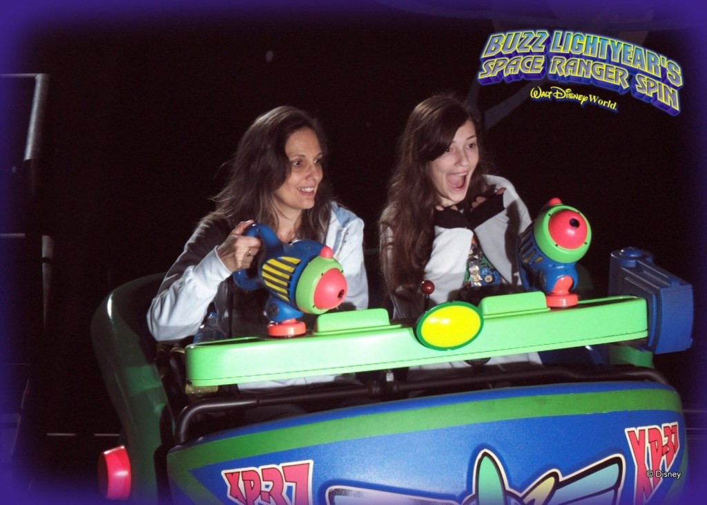 Like the version in California, this ride is a game similar in concept to Toy Story Mania and Buzz Lightyear, but you shoot “webs” from your wrists at spider-bots on 3D screens. The technological marvel (see what I did there?) includes four infra-red cameras hidden in the ceiling of the ride car that track the position of guests’ eyes, shoulders, elbows and wrists, to gauge where your webs (if you really had any) would land and how many bots you would destroy. It’s a fun game, although all that slinging is a little hard on the body! And in an ironic twist, despite her historical performances on Buzz Lightyear, Christina beat us all.