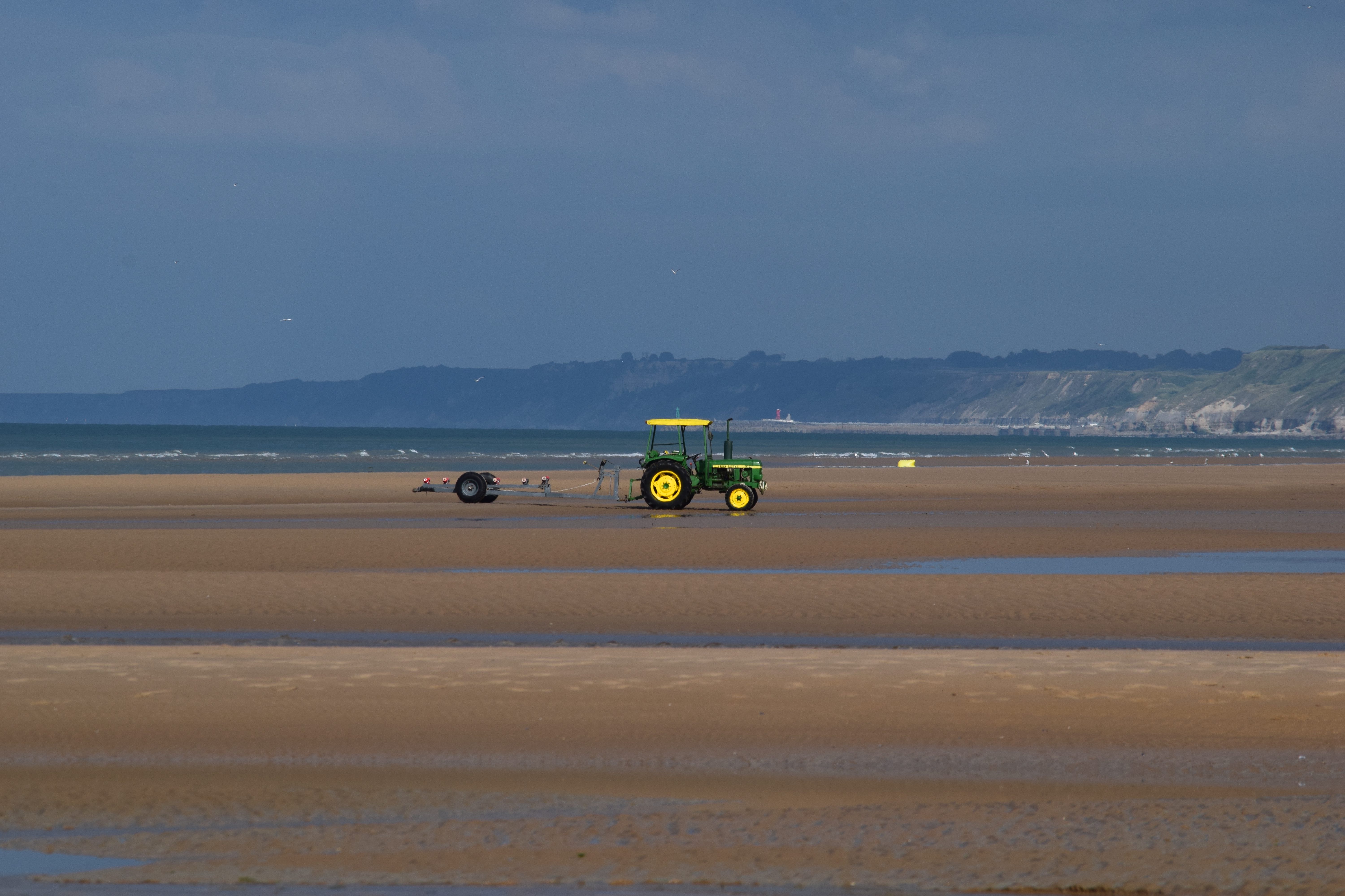 Visiting at low tide allowed us to walk way out onto the broad and flat beach. The sun was shining. People were fishing. Children were playing and laughing. Couples were strolling hand in hand. There were even tractors towing boats out and back across the sands!
