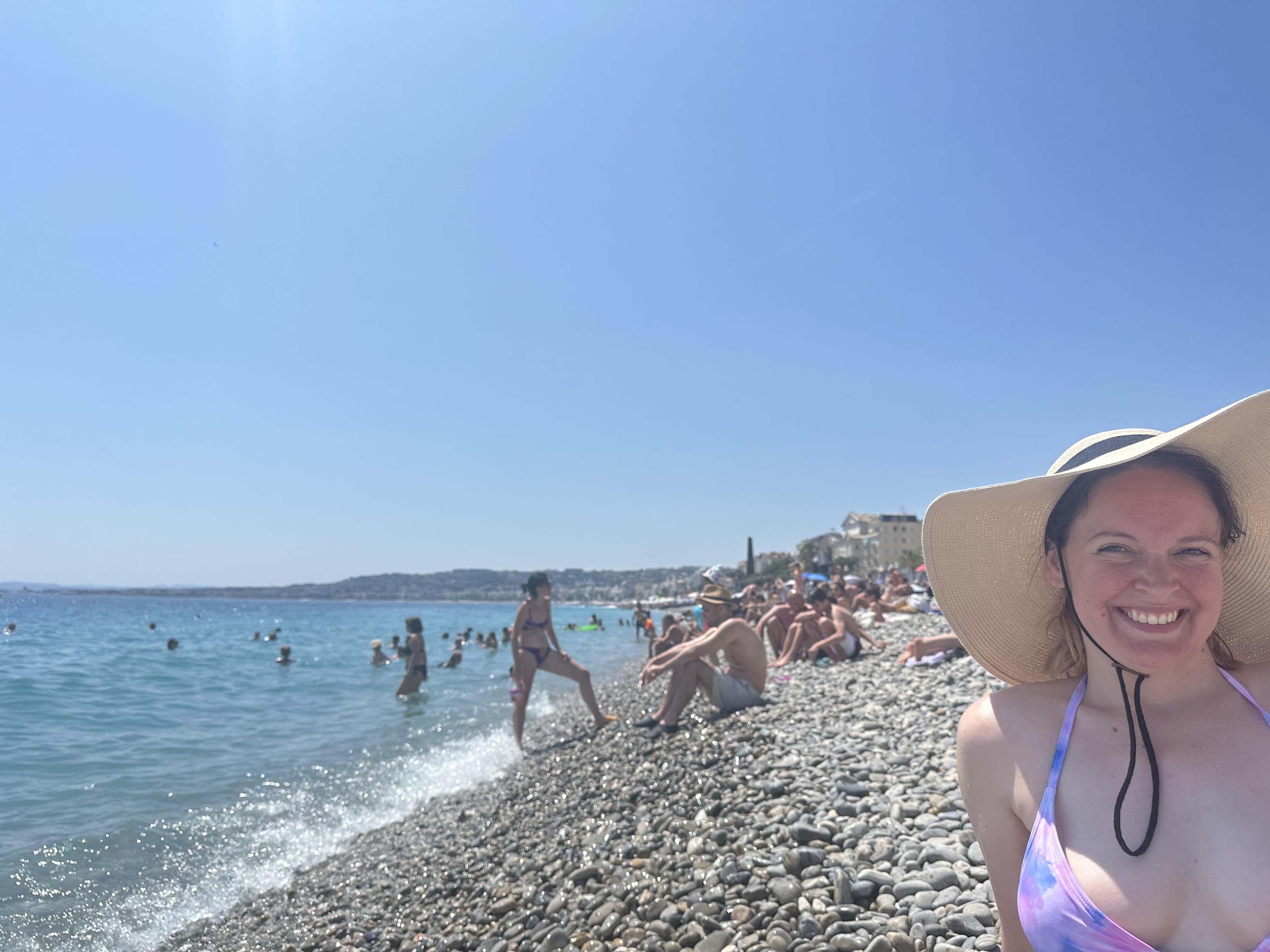 The beach in Nice, which I’ve seen described as “pebbly”, was more like a giant pile of gray stones. And by stones, I mean the ones used for hot stone therapy. As in they also store heat from the sun, of southern France, in June. So unless we were up for a hot coals challenge, walking barefoot was not an option!