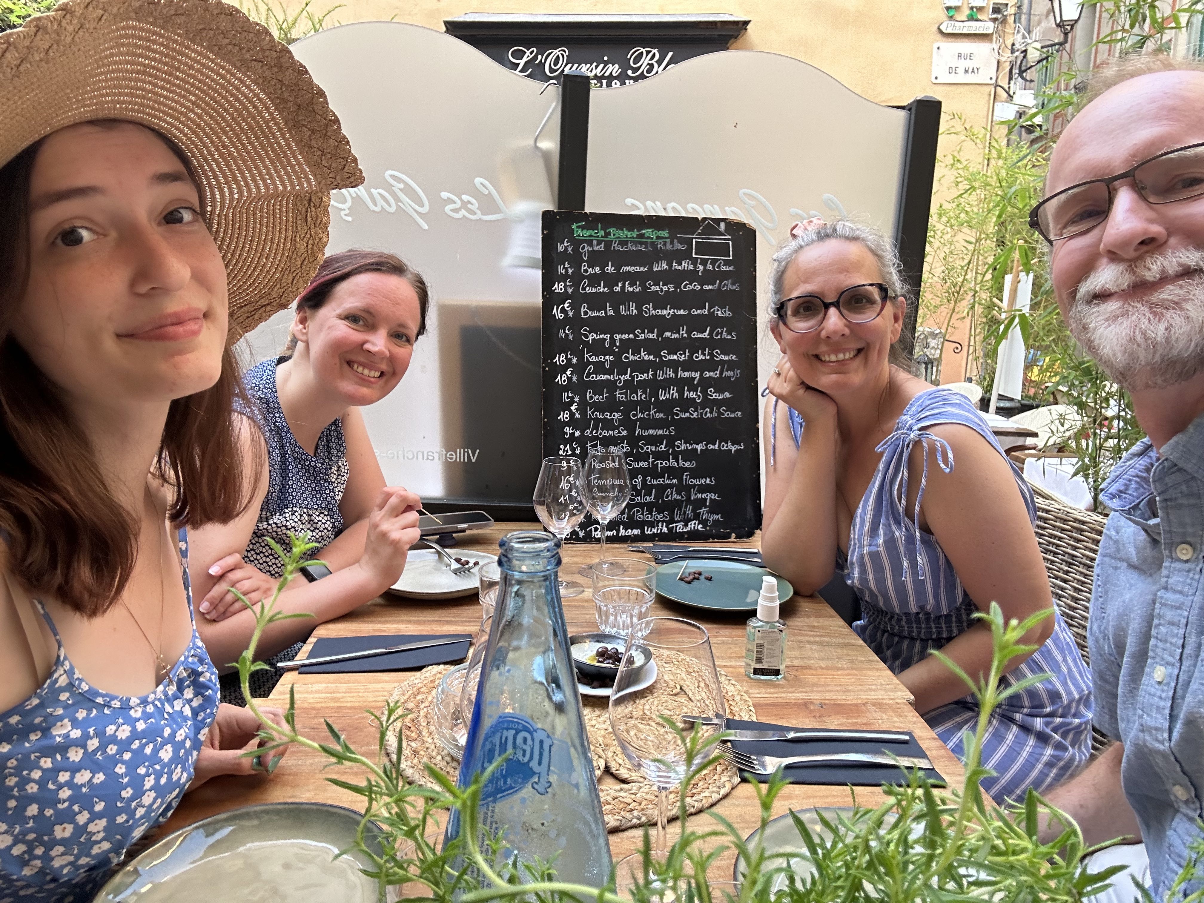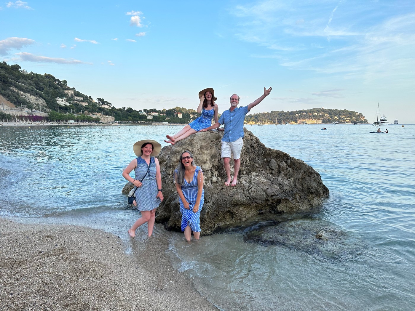 We dipped our feet in ocean for a few minutes, and then a kind woman offered to take our photo. Earlier in the evening, when we noticed that Doug, Christina and I were all dressed in blue and white, we told Jacquelyn she had to wear blue also. And that is how we accidentally ended up with what would turn out to be our 2023 Christmas card. So thanks Lady on the French Riviera who Stopped for us on Your Way to the Bar! You’re awesome!