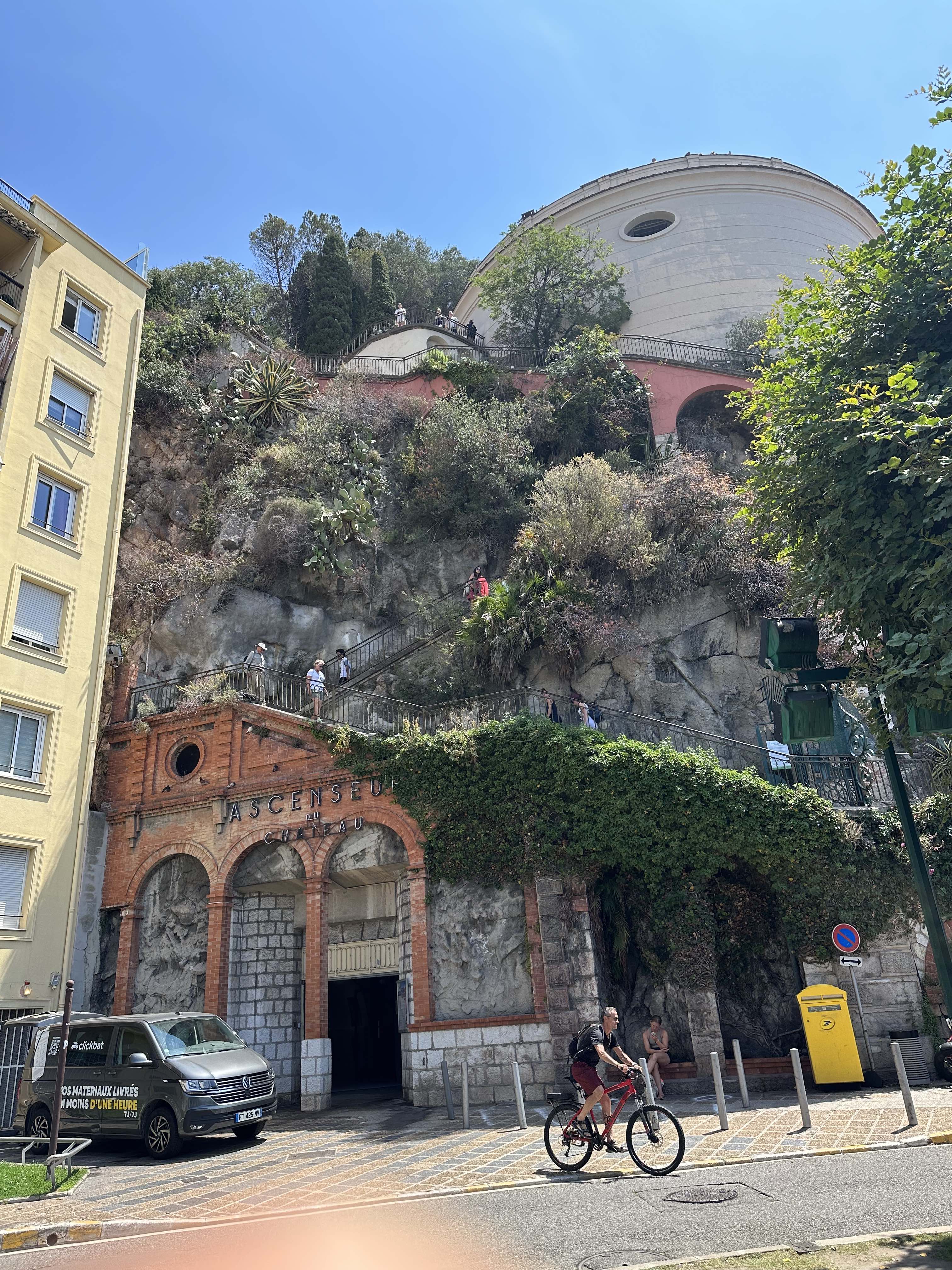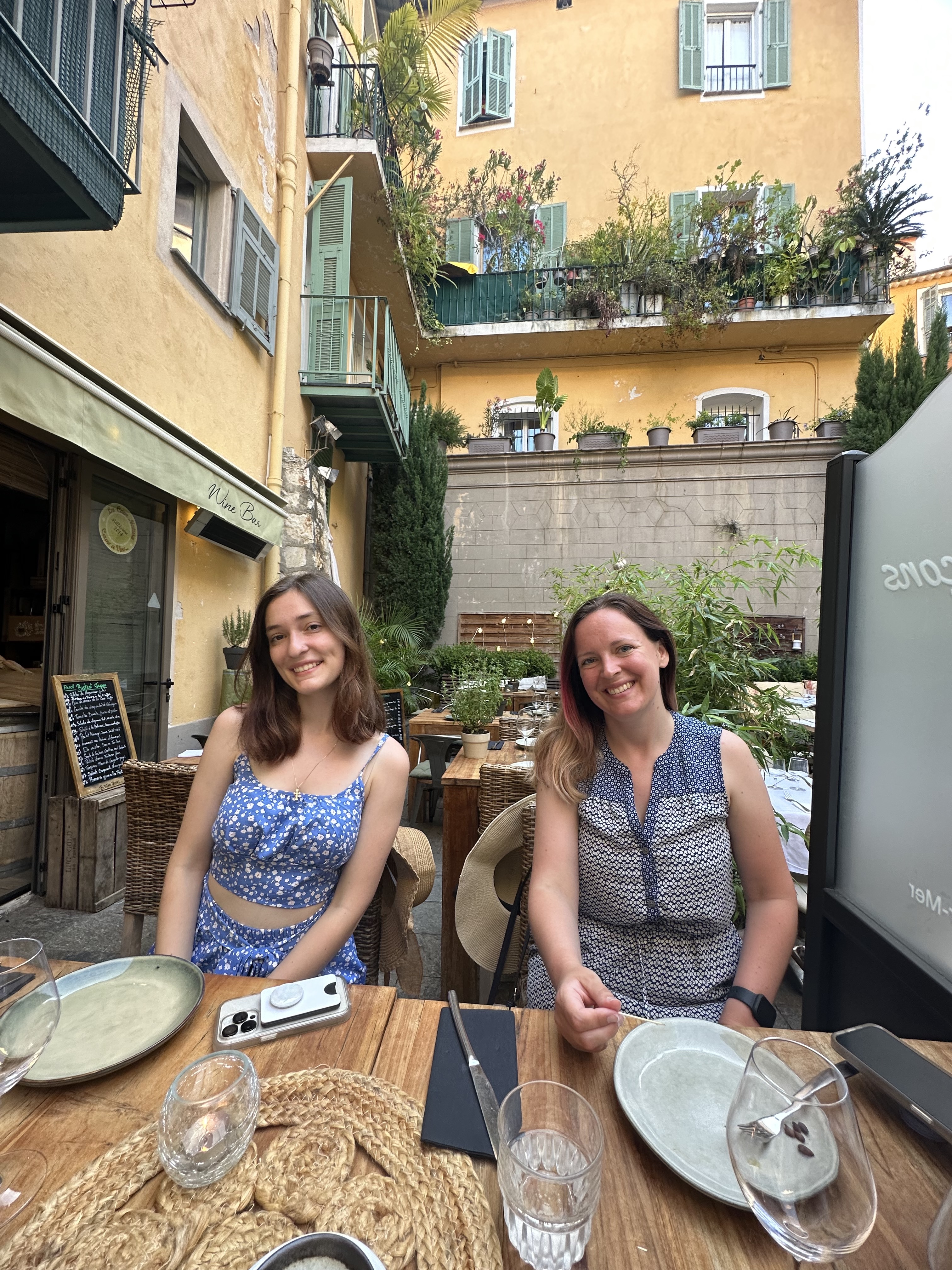 Sunday was our day to venture over to Nice, the popular resort town just on the other side of the hill to our west. We took an Uber to a piercing studio of all places because Christina has lost her nose ring and needed a new one. Then we walked to the coast until we found a cafe for lunch. They tried to seat us in these really fun chair swings, but unfortunately it was literally right next to the very smelly, very busy restroom. So we gave up our swings and sat at the tables that face the street and the sea.