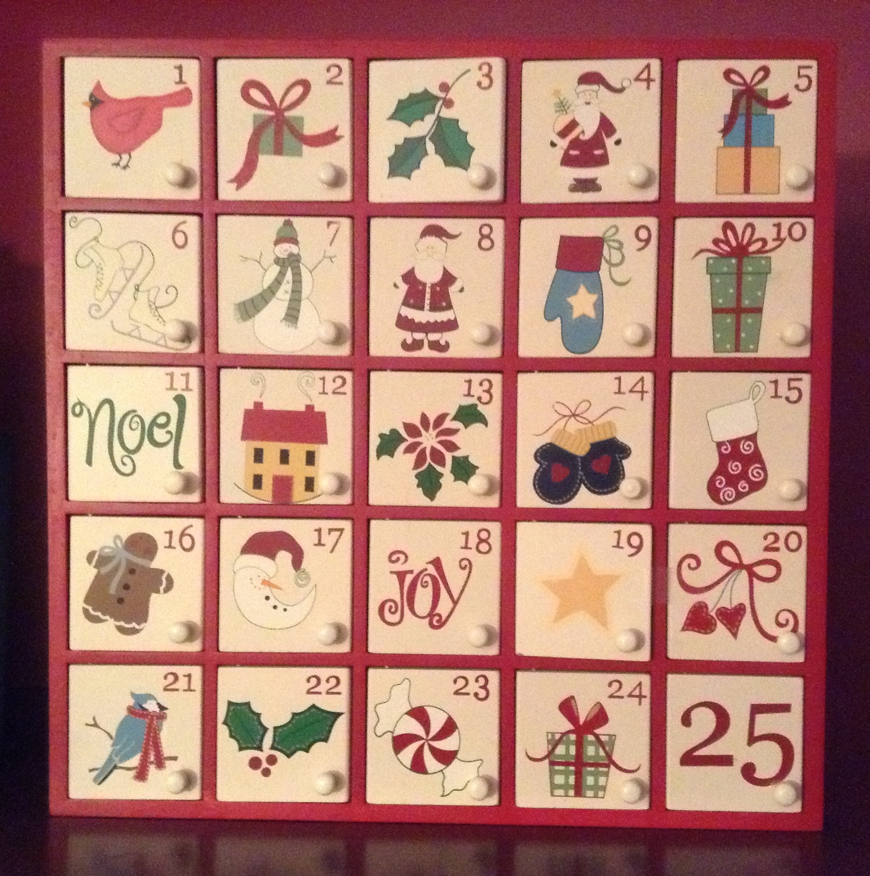 Things started to unravel, quite literally, when the wall-hanging began to fall apart. Just as my glue gun rescue flopped, I found, at the Christmas Tree Shops, a wooden, hand-painted calendar with little compartments and swinging doors for only $25. Which could be a good thing, or not, depending on your perspective.