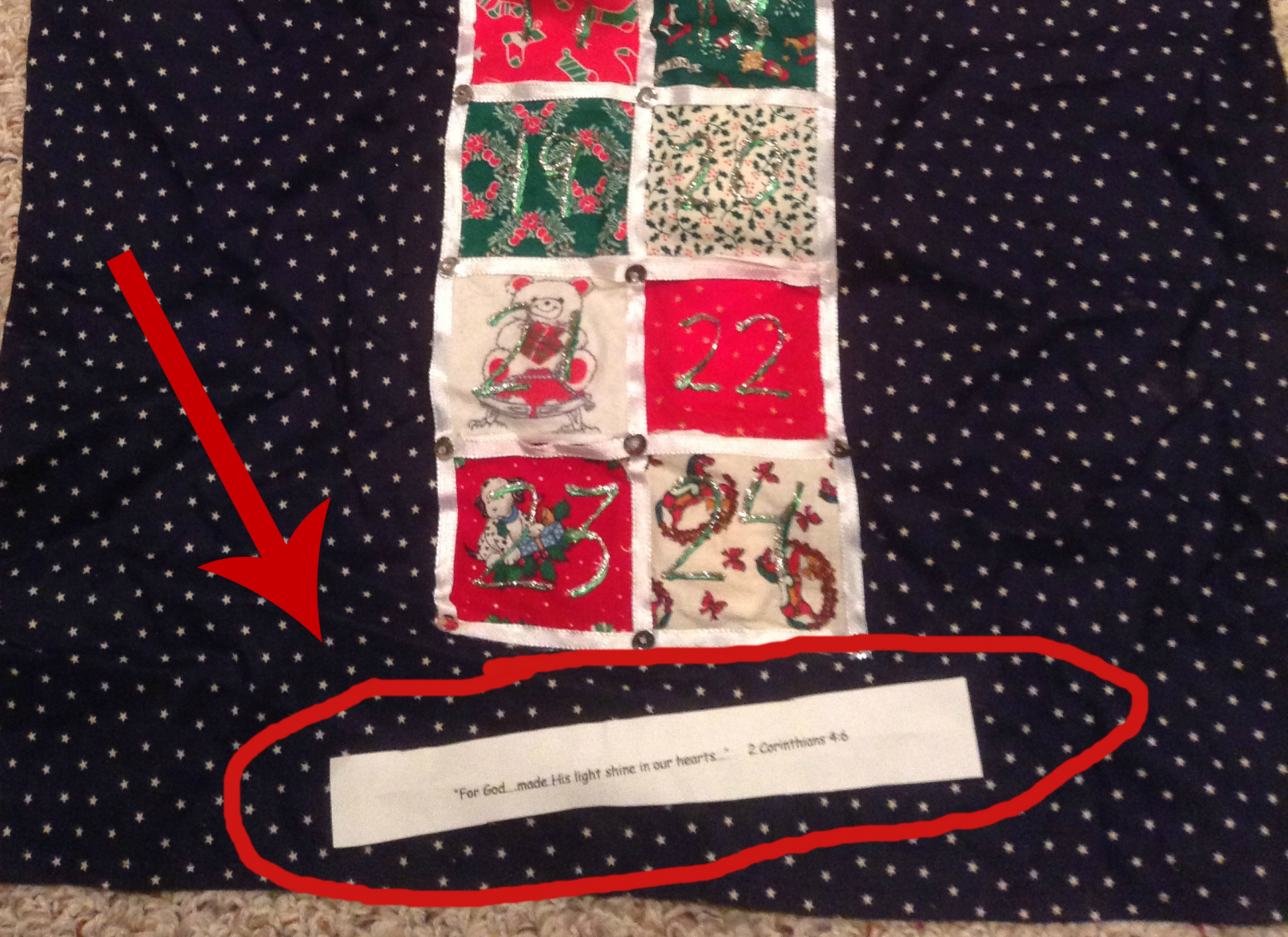 When our first daughter was still our only daughter, I had this grand idea to start an advent calendar. I crafted together (translation: it didn’t involve sewing) a fabric wall hanging with a large cross made of 24 two-inch square pockets.