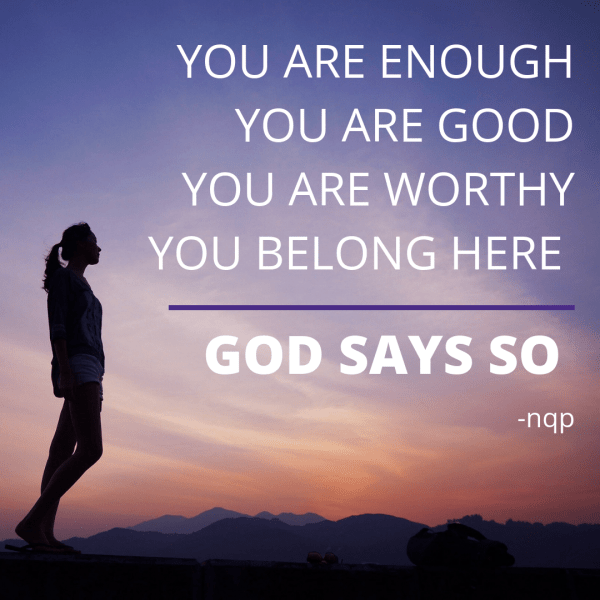 Over the last several months, God’s been speaking to me a lot on this subject. Here’s what I believe He has to say: You are enough. You are good. You are worthy. You belong here.
